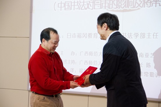 讲座前,广西师范大学副校长白晓军教授向小原俊树教授、姚明博士颁发了“广西师范大学客座教授证书”。本次讲学由广西师范大学美术学院副院长、东南亚艺术研究所所长陈兵教授担任学术主持,由福冈教育大学非常勤讲师姚明博士担任翻译。
