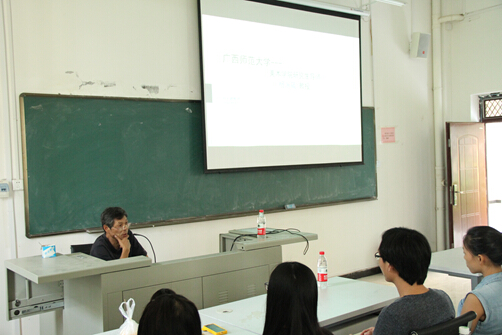 金秋时节,清风拂面。9月23日下午,我院基础教育部系主任、硕士生导师杨永葳教授应邀在雁山“纯道楼”2-106教室做了题为“艺术•创作”——漫谈研究生学习的学术讲座。讲座由学院党委副书记禤推鸰老师主持,2014级研究生60余人参加了讲座,报告厅座无虚席,讲座现场精彩纷呈,掌声雷动。