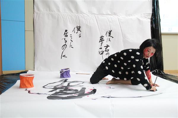日本福冈教育大学研究生小形有香在进行书法行为艺术展演