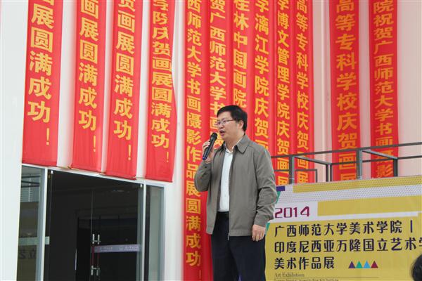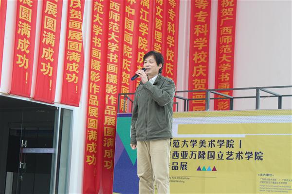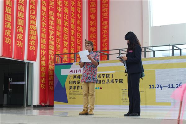 在开幕式上,美术学院何平静院长和印尼万隆艺术学院穆罕马德老师分别致辞,何平静院长在开幕式上对印尼万隆艺术学院的到来表示欢迎,他说本次作品展既是两国友好关系的见证,又可以让两校的师生彼此得到艺术上的启发,带来新的艺术灵感。穆悍马得老师代表印尼万隆艺术学院致辞,他说本次展出的艺术作品都带有浓厚的迅达族民族性格和民族特色,希望大家能够在相互尊重、相互理解、相互信任的基础上理解和欣赏。同时他也希望两校能有更多更好的交流。