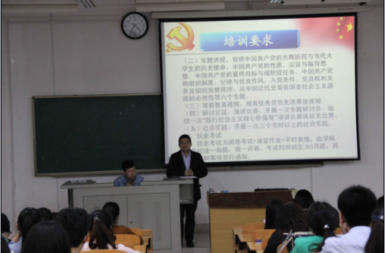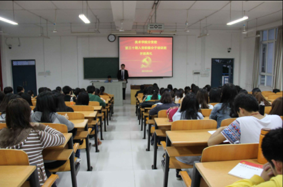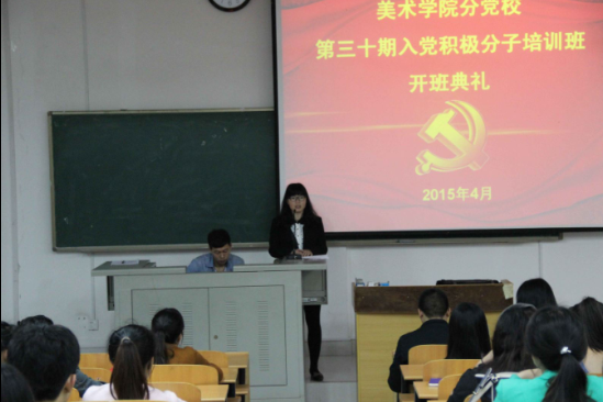 为深入学习贯彻党的十八届三中、四中全会精神和习近平总书记系列重要讲话精神,加强对入党积极分子的组织培训,调动积极分子在党的基本理论知识的自主性和积极性,努力培养更多党性强、作风正的入党积极分子加入共产党员队伍,美术学院分党校于4月24日晚上19:00在文四区203召开第三十期入党积极分子培训班开班仪式。学院党委副书记禤推鸰老师,分团委书记、绘画班党支部书记李敏老师,商业插画、书法专业党支部书记、2014级辅导员张坤丽老师,组织人事干事彭志琪老师以及培训班班长、组长和全体积极分子共计110人参与本次开班仪式。