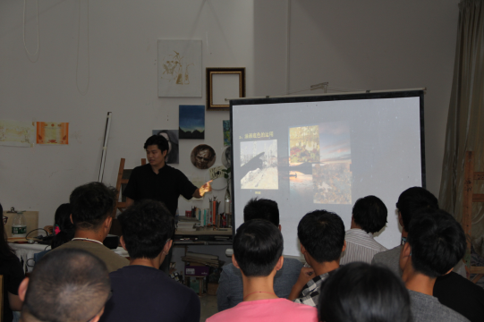 本次公开课由青年教师温怀宇讲授。他在3-501教室,为2014级绘画(油画)班讲授《油画风景写生》课。温老师通过多媒体和现场示范和点评的手段,就油画写生需要把握和注意的色调、取舍和技法等进行了讲解。