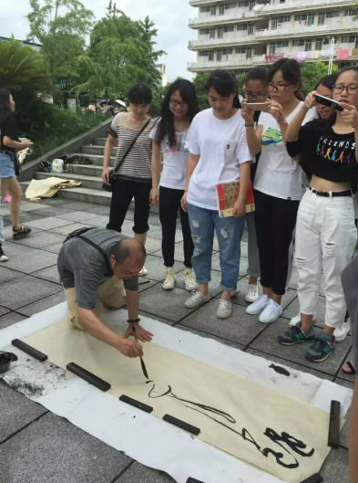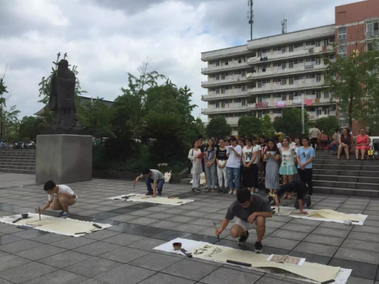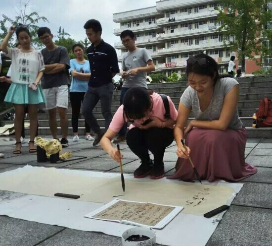 传习书法艺术,弘扬传统文化。6月1日上午十点,美术学院2014级书法团支部于在孔子广场举办了“墨韵•酷闪”主题团日活动。同学们一起挥毫笔墨,感受书法艺术的魅力。黎东明教授、博士到场传授书法技艺。此外,学院分团委书记李敏老师和辅导员张坤丽老师也出席了此次活动。