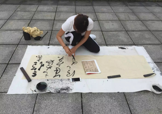 随后,同学们在孔子广场上垫上毛毡、铺好宣纸,分组书写大字。同学们或临摹。或创作,每一位同学都有自己的创作思想,大家互相观摩,互相学习,互相进步,你有你的可取之处,我有我的好,取你之长,加我之好,看到不一样的创作思维。