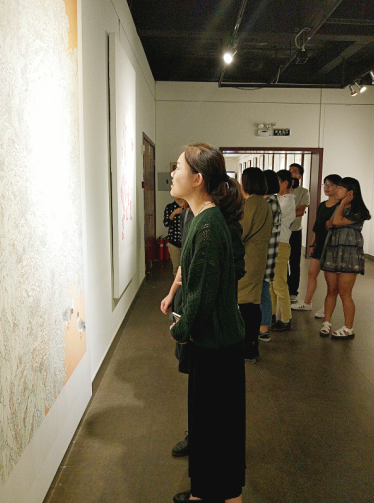 开幕式结束后,同学们在杨济安老师的带领下一同走进展厅参观展览。展览上的作品,向同学们深刻阐释了长征精神,展现了当代军人的精神风貌。在参观画展中,同学们看得特别认真,边比划着边交流。杨济安老师认真地为同学们解答疑问和讲解专业的艺术创作技巧,让我们通过这次纪念红军长征胜利80周年的画展从中学到不少专业知识和绘画技巧,更深刻了解红军精神。