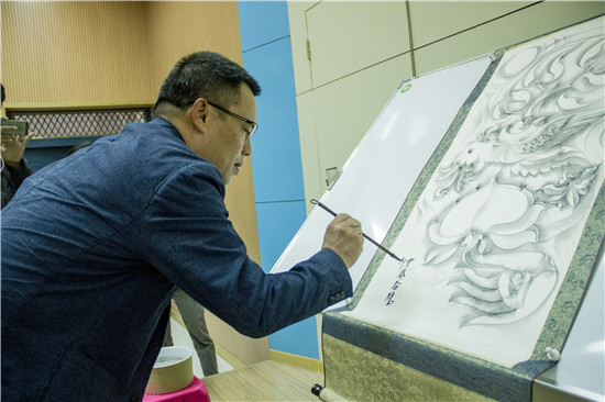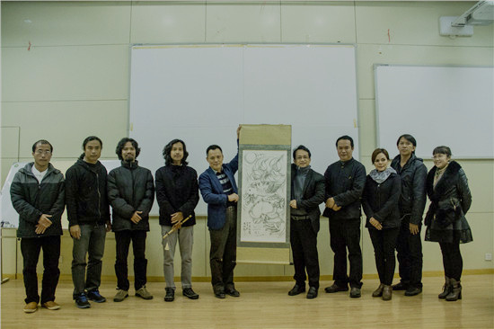 离披衮•玛高老师用泰国特有的乐器演奏了一曲动听的音乐,拉开了讲座的序幕。随后,泰北皇家理工大学艺术学院院长伴随着音乐声为在场师生朗诵一段专门为本次中外大学美术教育及创作学术交流周活动创作的诗歌,颂扬中泰友谊源远流长。离披衮•玛高老师在悠扬的笛声中现场创作一幅极具泰国文化特色的炭笔画,向大家展示了泰国浓厚的文化底蕴和佛教传统,赢得观众们的阵阵掌声和赞叹声。学院院长陈兵老师受邀在画作上题字,寓意中泰合璧。
