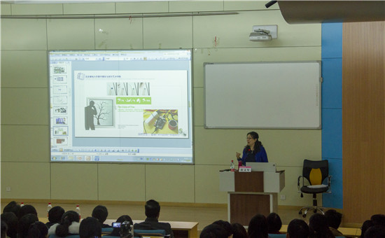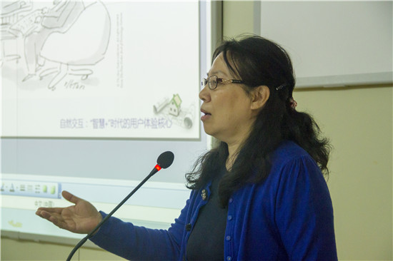 侯文君教授首先介绍北京邮电大学数字媒体与设计艺术学院的基本情况。随后,她向在场师生介绍设计在互联网中的运用,并通过对电子产品在实际生活中的使用举例,讲解自然交互技术的内涵,她指出:自然交互是利用虚拟现实技术消除人所处的环境和计算机系统之间界限的一种技术。计算机系统提供的虚拟空间中,人可以使用眼睛、耳朵、皮肤、手势和语言等各种感觉器官直接与之发生交互。随着人类社会和虚拟现实技术的发展,自然交互技术将广泛应用于人们生产和生活的各个领域,给我们提供更简便、智能、高效的体验与服务。同时,她提到智能时代,更强调的是用户体验,产品和服务需要充分了解用户的习惯和偏好,从而更好的提供个性化的功能和体验。
