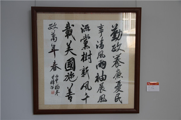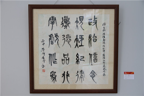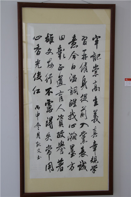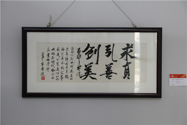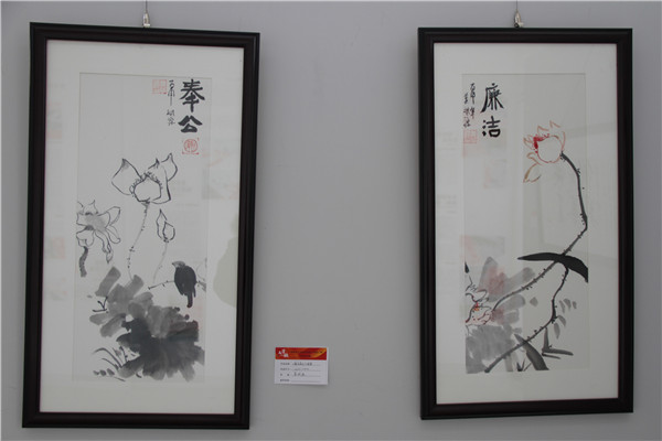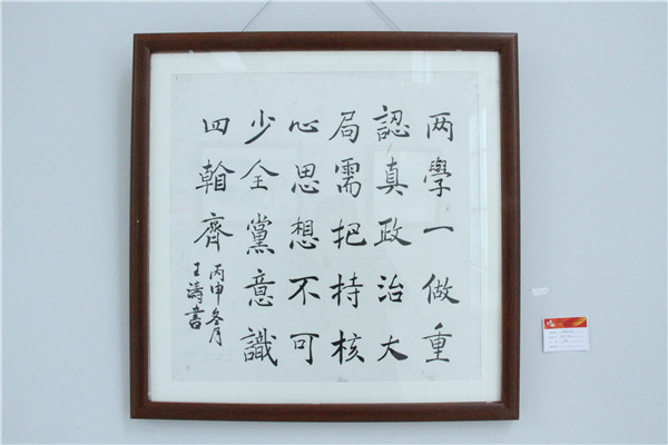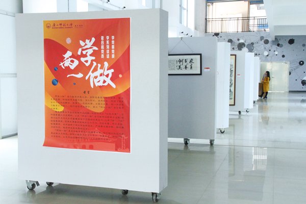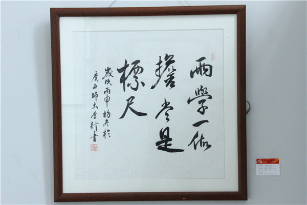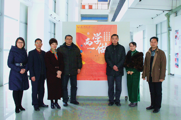 12月29日上午,美术学院举行“两学一做”学习教育书画展开幕式。展览共展出作品45幅。这些作品以“红色元素”、党和国家重大历史题材,以及“两学一做”学习教育过程等为主题,既有习近平总书记系列重要讲话中引述的古典名句,又有“学”、“做”的场景再现,还有充满象征韵味的山水花鸟,内容丰富、形式多样、喻意鲜明,共同阐明了牢记宗旨跟党走,严格要求履好职,勤政廉洁好作风,服务师生促发展的主旨。