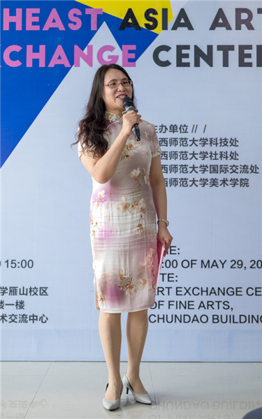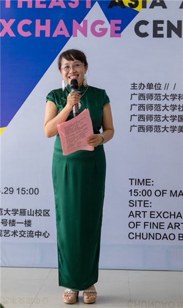 广西师范大学党委常委、校长助理王俊教授讲话。她说,学校历来重视对外文化艺术交流,实施“请进来、走出去”的发展战略,不断探索教师互派、学生交换项目、举办国际会议等多渠道多层次的文化教育交流合作方式,加强了与“一带一路”沿线各国的文化交流和沟通。东北亚艺术交流中心的揭牌,就是学校积极拓宽文化交流的新途径。该中心的成立,将与东南亚艺术研究所、中泰文化艺术交流中心一起,将成为学校对外艺术交流的“三驾马车”,形成联系东盟、辐射日韩的学术交流圈,构建国际艺术教育交流与合作的新格局。他希望东北亚文化艺术交流中心以学科建设和人才培养为依托,放眼区域经济社会发展和文化繁荣进步,进一步深化拓展国际合作与交流,努力把中心建成聚集艺术人才的小高地、创新创作的重要基地、成果展评的重要窗口和文化艺术互鉴融合的智库,共同合作打造区域文化艺术交流的品牌!