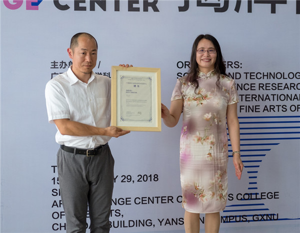 广西师范大学党委常委、校长助理王俊教授为海外教授颁发东北亚艺术交流中心研究员聘书