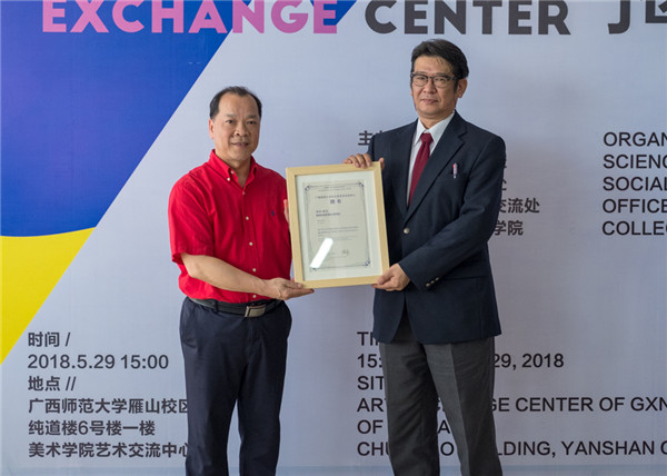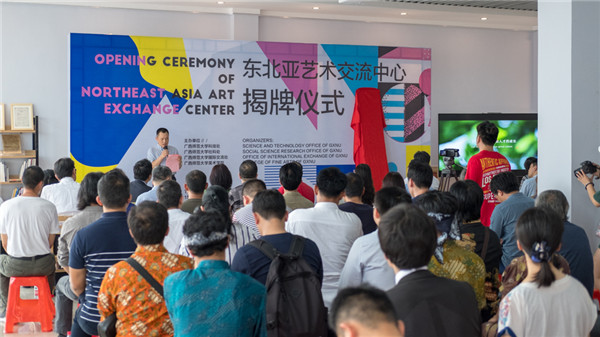 5月29日下午,广西师范大学东北亚艺术交流中心揭牌仪式在雁山校区纯道楼美术学院艺术交流中心举行。广西师范大学党委常委、校长助理王俊教授,原副校长、广西美术家协会副主席白晓军教授,韩国新罗大学、韩瑞大学,日本崇城大学、福冈教育大学、东京现代艺术研究所,印尼玛拉拿塔基督教大学、万隆艺术学院和巴厘岛象头师范大学,中国国家画院、湖北美术院、上海师范大学、南京艺术学院、邢台市美术家协会、深圳宝安画院等国内外30多个高校与科研、创作院所代表,广西师范大学国际交流处负责人,美术学院领导班子全体成员及师生代表共计130多人出席揭牌仪式。