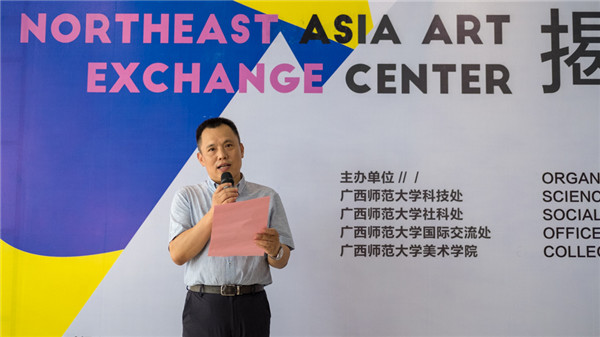 揭牌仪式上,广西师范大学东北亚艺术交流中心主任、美术学院院长陈兵教授讲话。他说,美术学院高度重视与国外高校的交流,特别是近年来,与日本福岗教育大学、韩国新罗大学、韩瑞大学等开展了一系列艺术交流合作,建立了深厚的友谊。陈院长指出,包括中国、日本、韩国在内的东北亚地区的艺术有诸多相通相近的地方,在世界艺术中占据着重要地位。成立广西师范大学东北亚文化艺术交流中心,目的在于更好地联络海内外的学者,研究和传播优秀文化,加强东北亚国家高校之间的艺术教育、研究和创作等方面的合作交流,为“一带一路”事业作出应有的贡献。