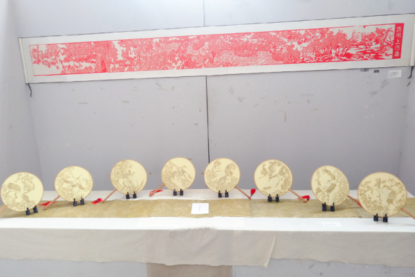本次作品共计展出7组31件剪纸作品,包括单色、套色,染色等形式。作品包括《清明上河图系列》、《醉美广西》、《铜鼓》、《河东印象》、《仙鹤系列的团扇》、《12生肖系列花瓶》等。其中,高校联合剪纸大赛的获奖作品《醉美广西》围绕广西壮族自治区成立六十周年进行创作,展现了广西的美丽自然风光和民族特色,抒发对广西发展取得巨大成就的赞扬之情。10米长卷《河东印象》是创作者对家乡的一种赞美,也是对历史的一种艺术再现。《仙鹤系列的团扇》就新材料使用进行新的尝试,让传统剪纸表现方式得到了新的突破与发展。