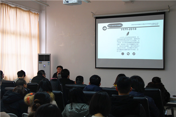 张教授在报告中谈到,近十年来(2008-2018)区域文化、民族文化、传统复兴是近年来立项的最显著特点。立项总数逐年上升,课题申报打破了专注宏大课题研究的规律,无论是美术学、设计学都呈现出细化的特征,研究领域从宏观走向具体,从单一走向多元。同时也与西部大开发、一带一路、工匠精神、精准扶贫等国家政策紧密联系。民间、民族、民俗艺术和非遗保护也从早期的艺术学理论研究范畴转移到设计学研究范畴之中。此外,在美术学研究中,关注于本土传统美术中的画种、观念、断代史、特定时期、区域性名家等课题增多,此类应是未来的申报趋势。最后,张犇教授以互动形式与青年教师进行学术交流。报告会在一片掌声中落下帷幕。