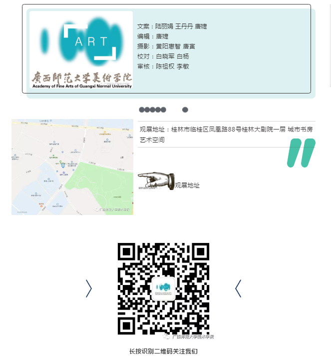 本次策展人白杨老师表示,将高校的教学成果向社会大众作一个汇报与展示,目的是为了更好地促进高校教学,提升研究生的学习质量和学术水平;另外也通过高校内外合作的机会,把桂林的山水画艺术和文化作一个很好的宣传与推广,向社会大众展示优秀的山水画作品、特别是以桂林山水为题材的中国画作品,进而为“寻找桂林文化的力量、挖掘桂林文化的价值”作出积极的贡献。