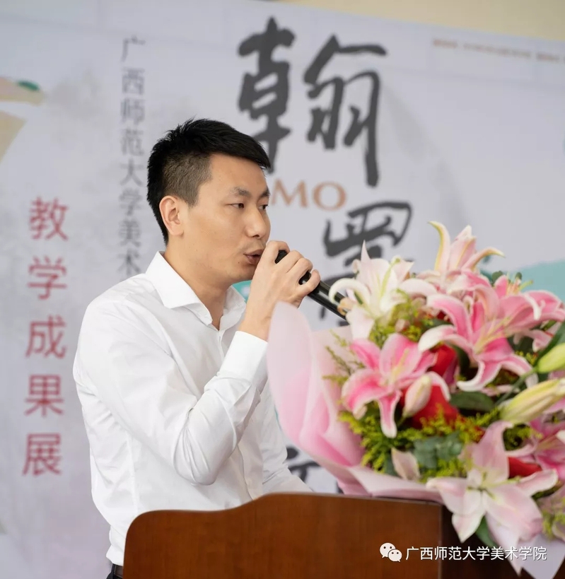 李金朋同学作为学生代表汇报了本次教学成果展览的成果,对广西师范大学美术学院领导、老师的培养、鼓励和支持表达了真挚的感谢。本次展览的顺利开幕又恰逢纪念五四运动100周年,这也代表着五四精神激励着年青一代不断探索、不断追求更高的目标和精神呼唤。作为新时代大学生,在继承传统的同时,不断创新,力求突破,希望能在未来做出更多符合时代特色的艺术作品。