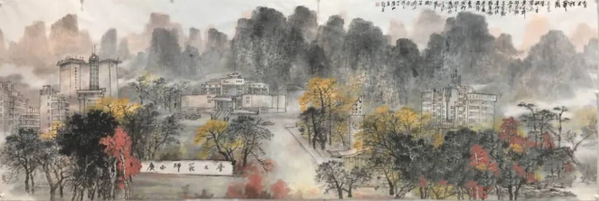 此图将广西师范大学育才校区的典型景物作为描绘对象,采用俯瞰式的构图方法,以遒劲郁勃的线条,滋润浑厚的墨色,以葳蕤繁茂的树木,鳞次栉比的建筑,表达学校“聚山水灵气,树华夏栋梁;重礼智诚信,育桃李芬芳”的自然与人文的精神内涵。图中周道如砥,秋山渐远,用平坦的道路和金秋的景色,寓意学校广阔的前景及丰硕的成果。