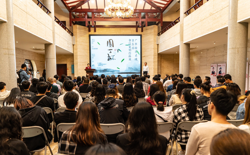 2021年5月22日上午,由广西壮族自治区教育厅、广西师范大学主办,广西教育学会书法教育专业委员会、广西师范大学美术学院承办,桂林画院协办的“园丁杯”广西教育系统第五届书法篆刻作品展在桂林美术馆开幕。