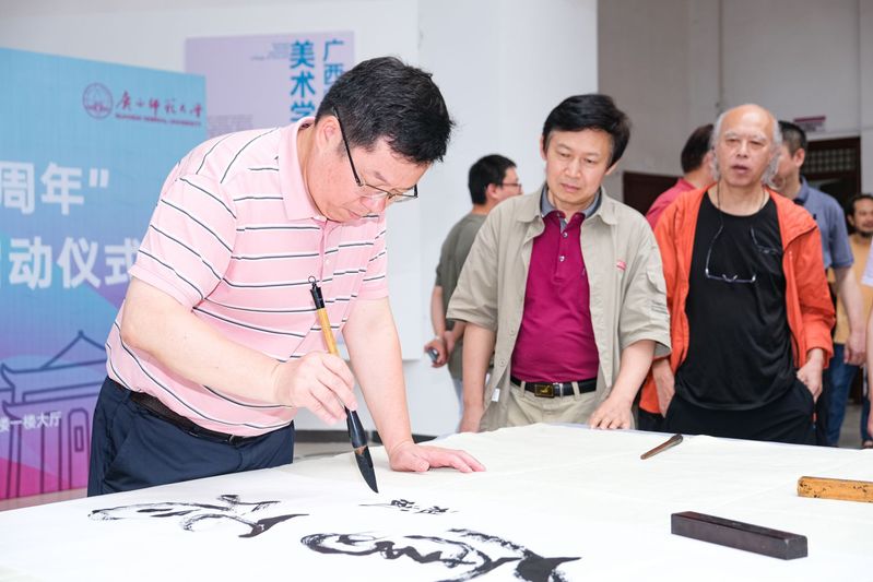 启动仪式上,贺祖斌宣布广西师范大学“庆祝建校90周年”绘画、书法、摄影作品创作活动正式启动,随后现场即兴创作“奋飞”书法作品为学校90周年校庆献礼。