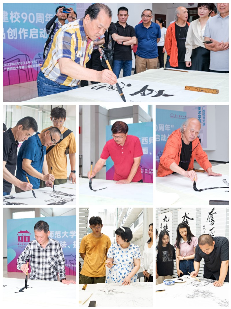 6月18日上午,由广西师范大学主办,美术学院、设计学院、校工会、离退休工作处联合承办“庆祝建校90周年”绘画、书法、摄影作品创作启动仪式在雁山校区纯道楼大厅举行。校长贺祖斌、原副校长白晓军、广西美协副主席张贤、广西书画院美术馆馆长周松、桂林市书法家协会副主席谢光辉、桂林旅游学院艺术设计学院院长韦剑华、桂林群众艺术馆副馆长黄宏辉、桂林文联副研究员黄正鹏、南国今报摄影总监颜篁、临桂书法院常务副院长梁承华、桂林学院艺术设计学院环境艺术系主任邢福生、桂林画院专职画家张世霖出席启动仪式,校长办公室、学生工作部(处)、校工会、离退休工作处、校友工作办公室、设计学院主要负责人及联络员、美术学院主要领导及师生90余人参加启动仪式。美术学院主要负责人主持启动仪式。
