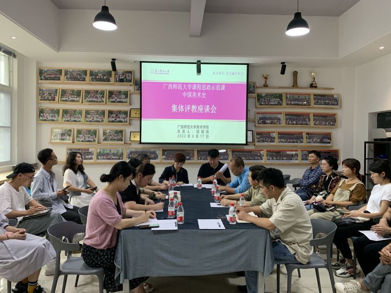 6月17日上午,美术学院在纯道楼教工之家举行广西师范大学课程思政示范课中国美术史集体评教座谈会。学院副院长(主持行政工作)陆丽娟、党委副书记周晓霞、副院长刘宪标、刘莹,各专业系主任及教师代表10余人参加集体评教座谈会。