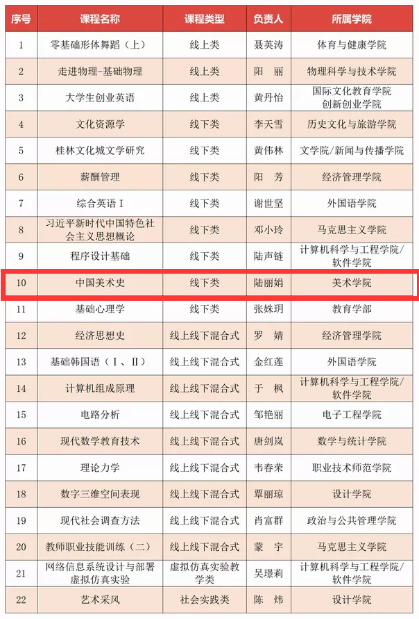 自治区教育厅印发的《关于公布第三批自治区级一流本科课程的通知》正式公布了第三批自治区级一流本科课程的认定结果,我校共有22门课程被认定为第三批自治区级一流本科课程。其中,美术学院陆丽娟教授负责的《中国美术史》成功入选线下类一流本科课程,实现了美术学院区级一流本科课程建设新突破,也是美术学院本科教育教学取得的标志性教学成果之一。