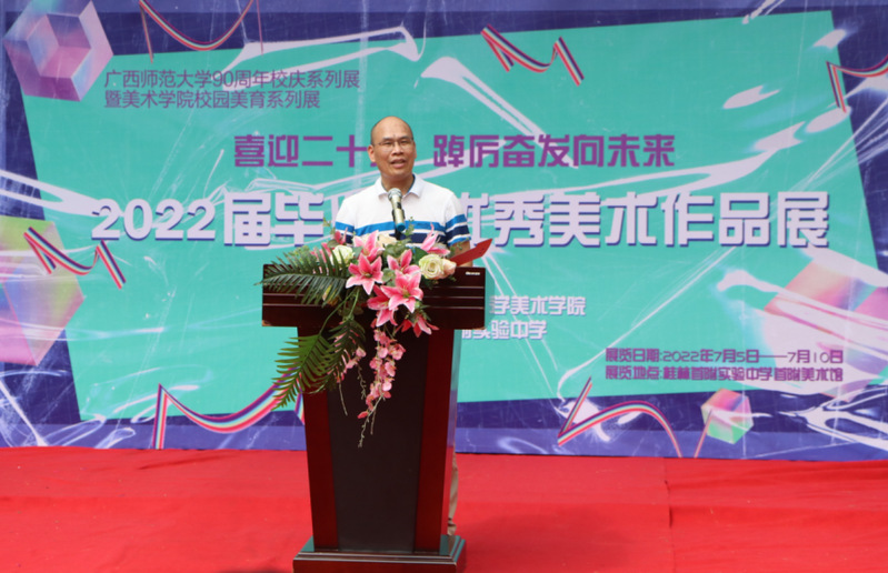 7月5日,美术学院在桂林市首附实验中学举办90周年校庆系列作品展暨2022届毕业生优秀毕业作品展开幕式。美术学院领导班子、桂林市首附实验中学领导、专任教师代表及师生代表参加本次开幕式。