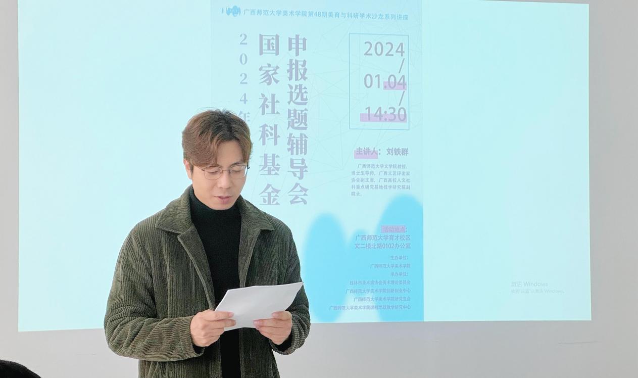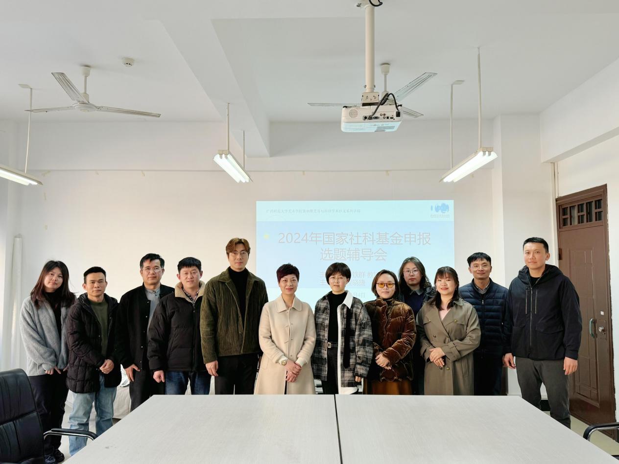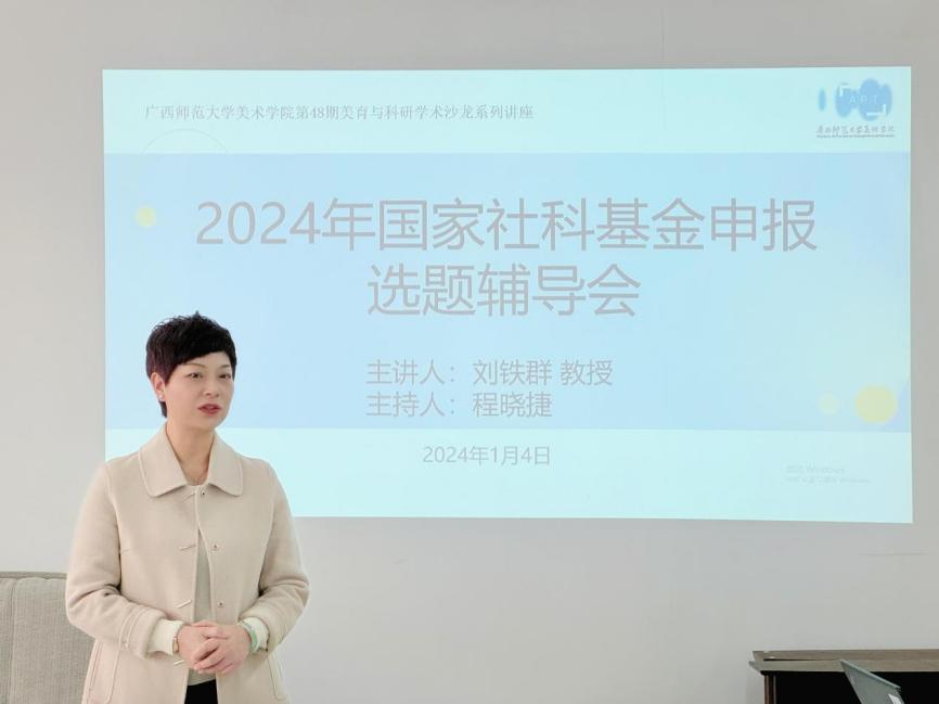 为推进美术学院2024年度国家社科基金项目的申报工作,1月4日下午, 美术学院邀请广西师范大学文学院博士生导师刘铁群教授在育才校区第二文科楼102会议室召开国家社科基金2024年度艺术学项目申报辅导会。学院院长陆丽娟、获得国家社科基金培育项目的教师及骨干教师参加会议,会议由学院副院长程晓捷主持。