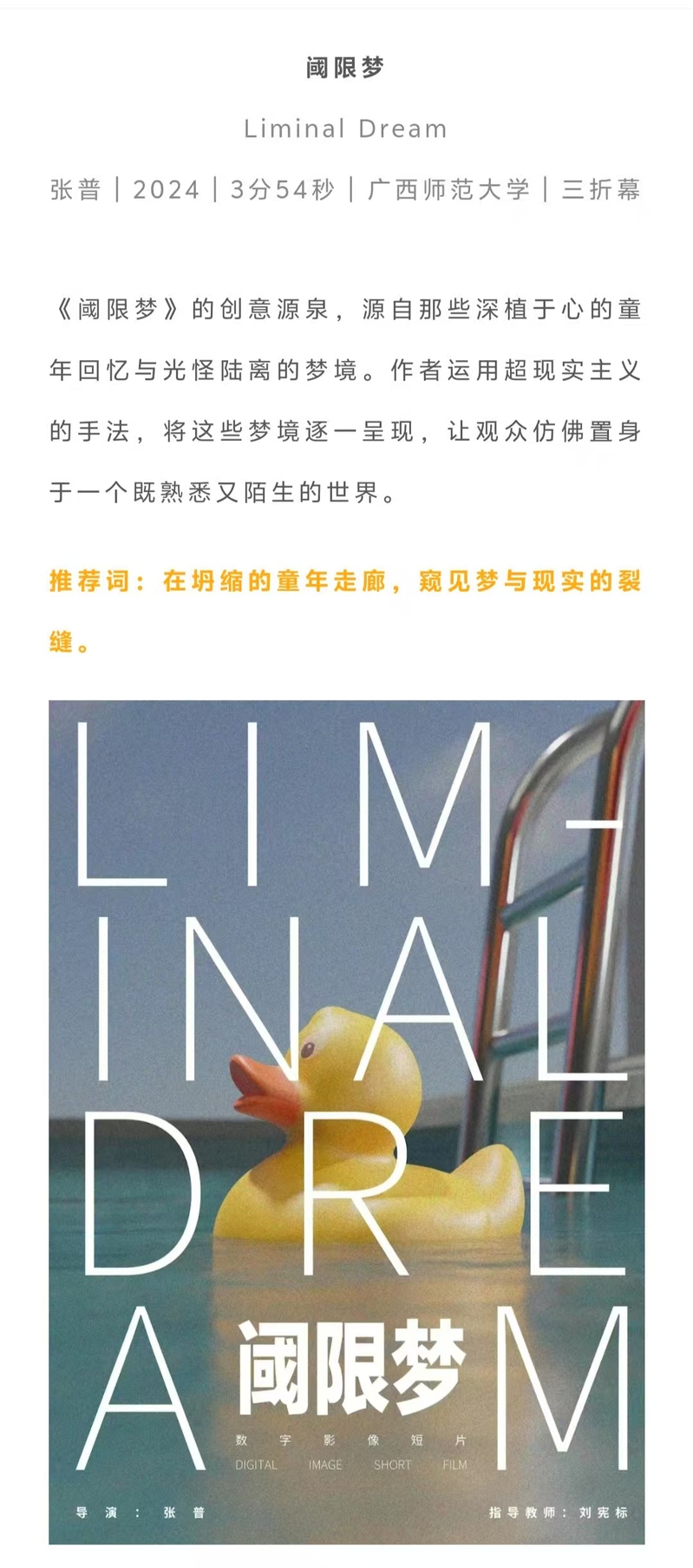 近日,由北京市人民政府、中央广播电视总台主办的第十五届北京国际电影节公布展映完整片单,美术学院2023级硕士研究生张普的数字短片《阈限梦》入围“无界∞沉浸单元”。