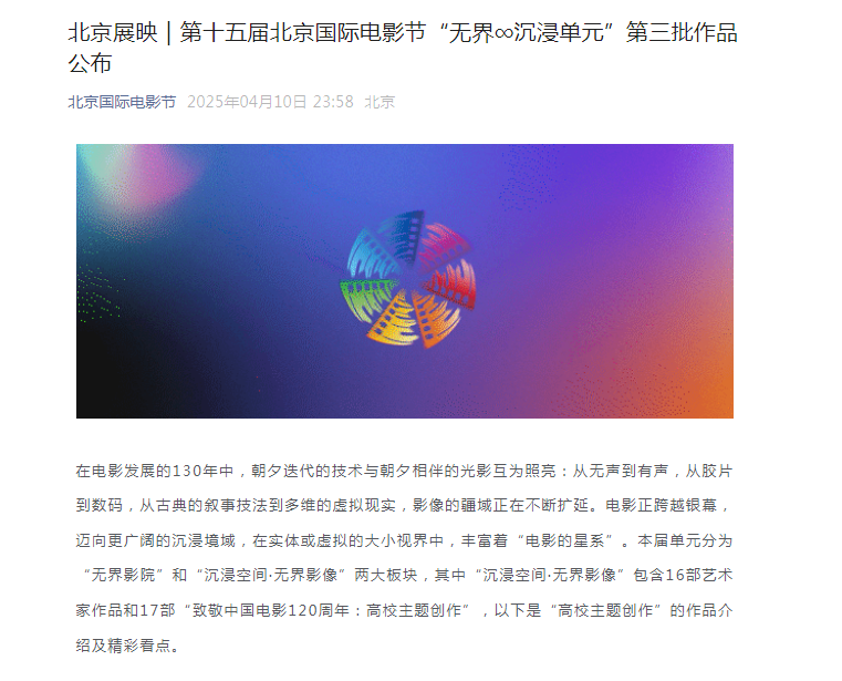 据悉,第十五届北京国际电影节将于4月18日至26日举行,汇聚了300余部影片,涵盖全球佳作、经典修复、华语新锐等多元多样的精彩作品。本届“无界∞沉浸单元”以“电影的星系”为主题,在策展思路、展映空间与展映技术形式等多方面有较大提升。单元作品横跨VR、AR、MR、环幕、三折幕及影像交互装置等多种形态,以技术为笔、体验为墨,重塑光影的边界。作品单元分为“无界影院”和“沉浸空间·无界影像”两大板块,其中“沉浸空间·无界影像”包含16部艺术家作品和17部“致敬中国电影120周年:高校主题创作”。张普的数字影像作品《阈限梦》采用了3D激光雷达扫描、三维软件转化等数字技术进行生成创作,创意源自那些深植于心的童年回忆与光怪陆离的梦境。作者运用超现实主义的手法,将这些梦境逐一呈现,让观众仿佛置身于一个既熟悉又陌生的世界。