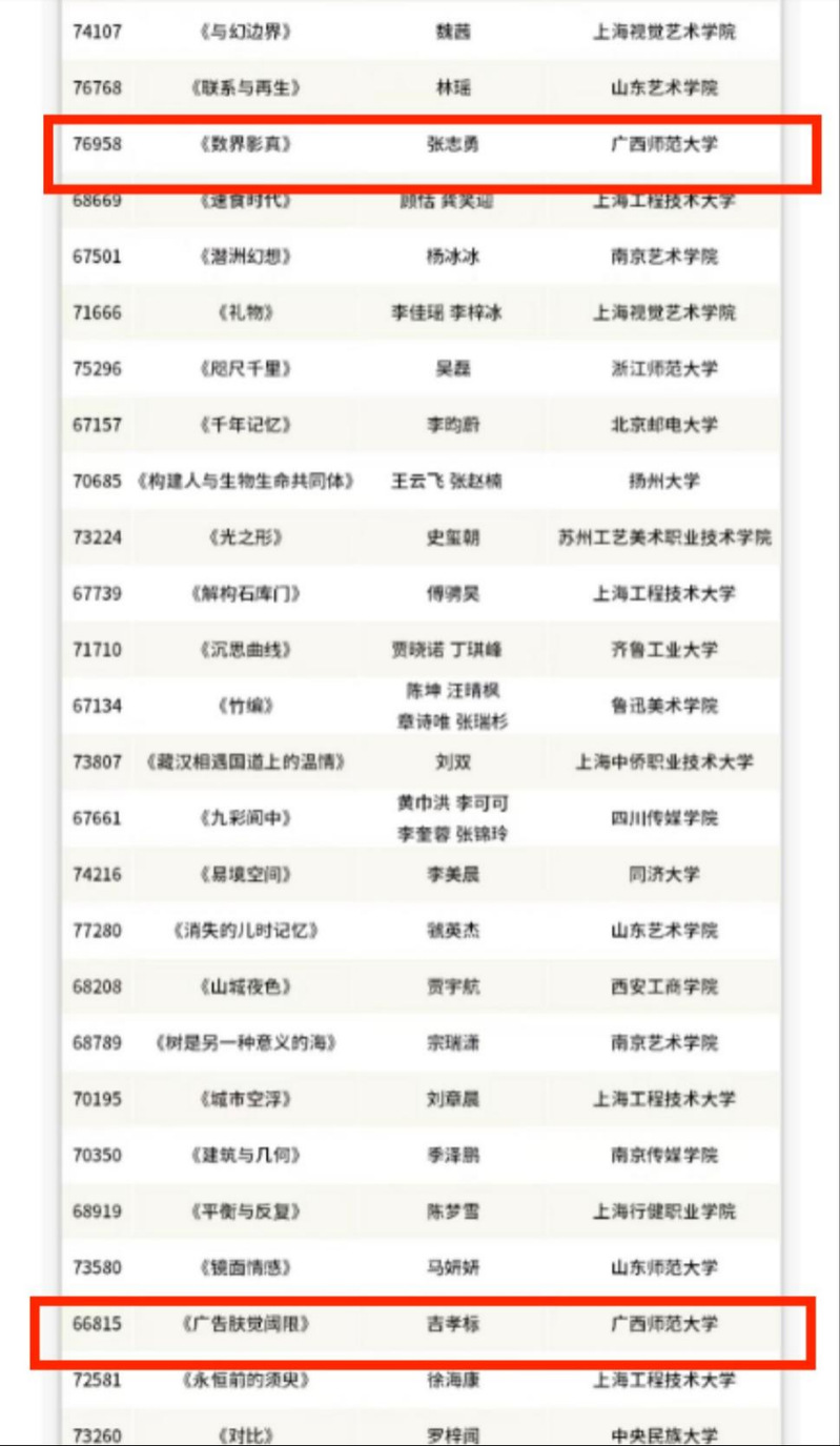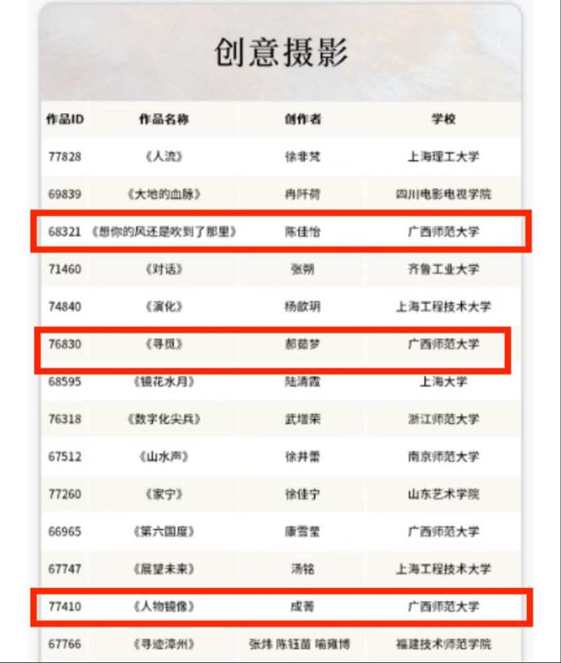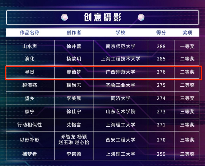 据悉,本届创意节以“青春创想·美育筑梦”为主题,汇聚大学生的智慧与激情,共同探索美育在新时代的战略意义与强国价值,以青春之名,为中华民族伟大复兴贡献青春力量。本次大赛共设6个常规赛道,分别是创意美术、创意产品设计、创意摄影、创意短片和创意交互设计。美术学院2023级硕士研究生郝茹梦的作品《寻觅》入围总决赛9强,最终获得创意摄影二等奖、陈佳怡的《想你的风还是吹到了那里》、康雪莹的《第六国度》、成菁的《人物镜像》,蒋理的《只是我们》、张志勇的《数界影真》、吉孝标的《广告肤觉阈限》作品分别入围创意摄影百强;吉孝标的《爱驻东江》和张普的《鲲鹏》《阈限梦》作品分别入围创意短片百强。