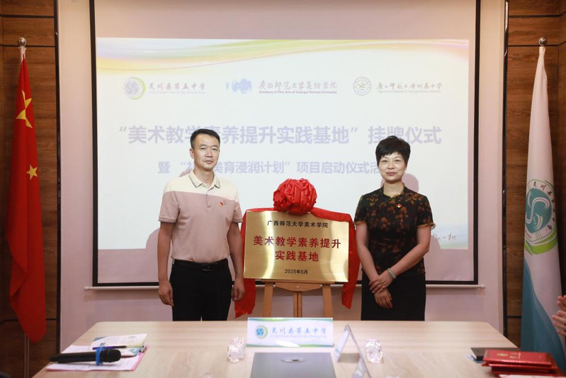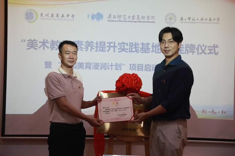 广西师范大学美术学院行政主要负责人和灵川县第五中学负责人共同为“美术教学素养提升实践基地”揭牌,美术学院研究生第三党支部书记为副校长蒙志红颁发基地导师聘书。