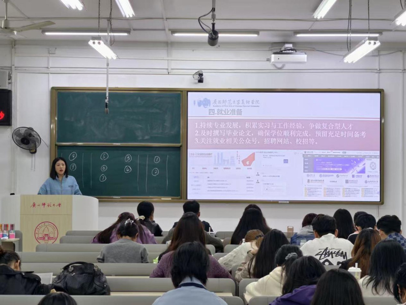 为深入贯彻《关于加强和改进新时代高校思想政治工作的意见》中“建设高素质思想政治工作队伍”的要求,积极响应国家促进高校毕业生就业的政策部署,11月5日晚,学院在文一区302教室成功举办“艺生艺职”之“研途助力 筑梦青春”主题交流会。活动由研究生辅导员主持,全体研究生参会,旨在通过朋辈引领,破解艺术类研究生就业备考难题,引导学生将个人职业规划融入国家发展需求。