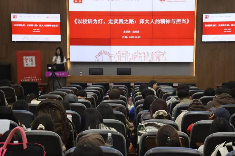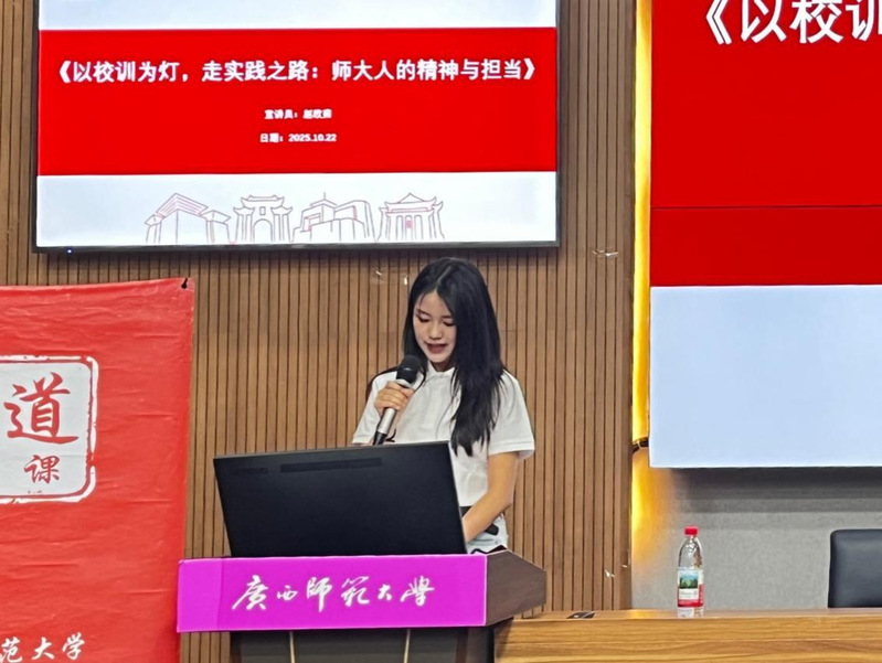 为深入学习贯彻习近平总书记关于教育的重要论述,传承弘扬学校精神文化传统,10月22日下午,由我院承办的第一百三十四期“望道微课”专题宣讲活动如期举行。本期微课以《以校训为灯,走实践之路:师大人的精神与担当》为主题,“望道微课”理论宣讲团宣讲员音乐学院2024级研究生赵欣茹担任主讲人。