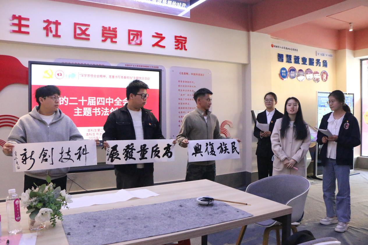 为深入学习贯彻党的二十届四中全会精神,创新理论学习形式,近日,美术学院本科生书法学党支部与马克思主义学院本科生第二党支部在恬园学生社区联合举办“深学思悟全会精神,笔墨书写青春担当”主题党日活动。两支部党员全员参与,共同探索理论学习和艺术实践的创新融合。