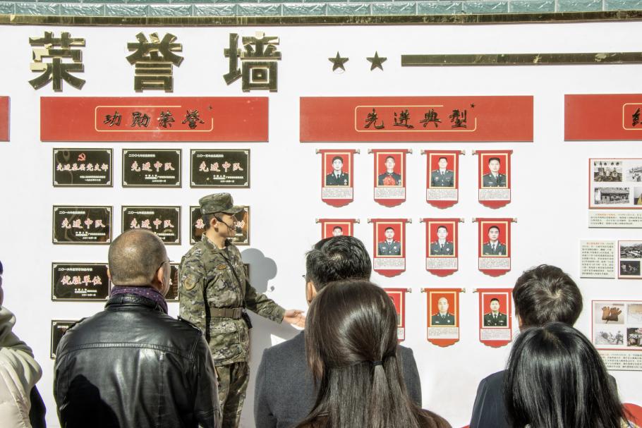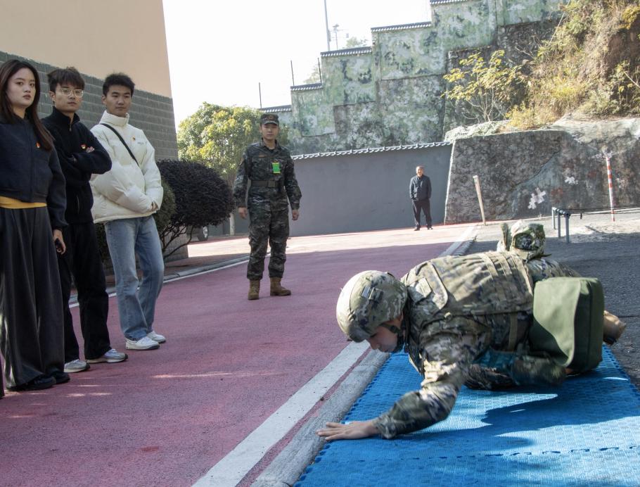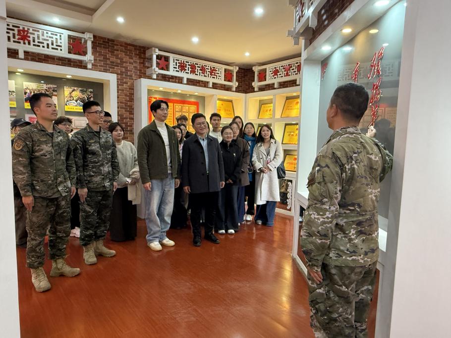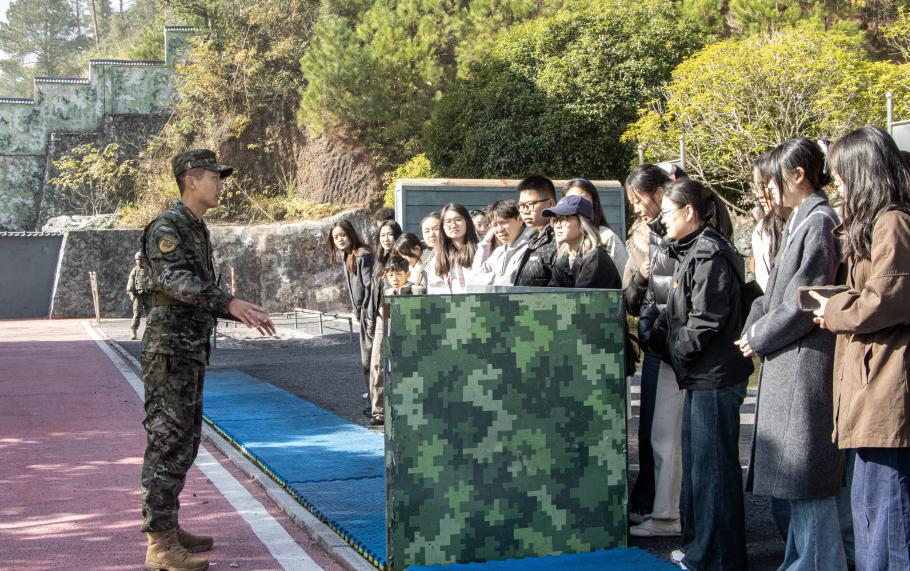 中队讲解员结合湘江战役的史实将红军的忠勇事迹与中队历代官兵“忠诚护国”的优良传统相结合,通过荣誉勋章墙、历史照片等实物载体,生动再现了红色基因在军营的传承脉络。研究生党员们边走边记、不时驻足,在触摸军营历史、观摩中队党建文化阵地的过程中,深刻体悟“人民军队为人民”的根本宗旨,为后续党建共学筑牢思想根基。在军事科目演示环节,中队官兵动作行云流水间尽显专业素养,战术配合中彰显战斗精神,让在场研究生党员直观感受新时代军人“召之即来、来之能战、战之必胜”的过硬作风,赢得在场师生阵阵掌声。