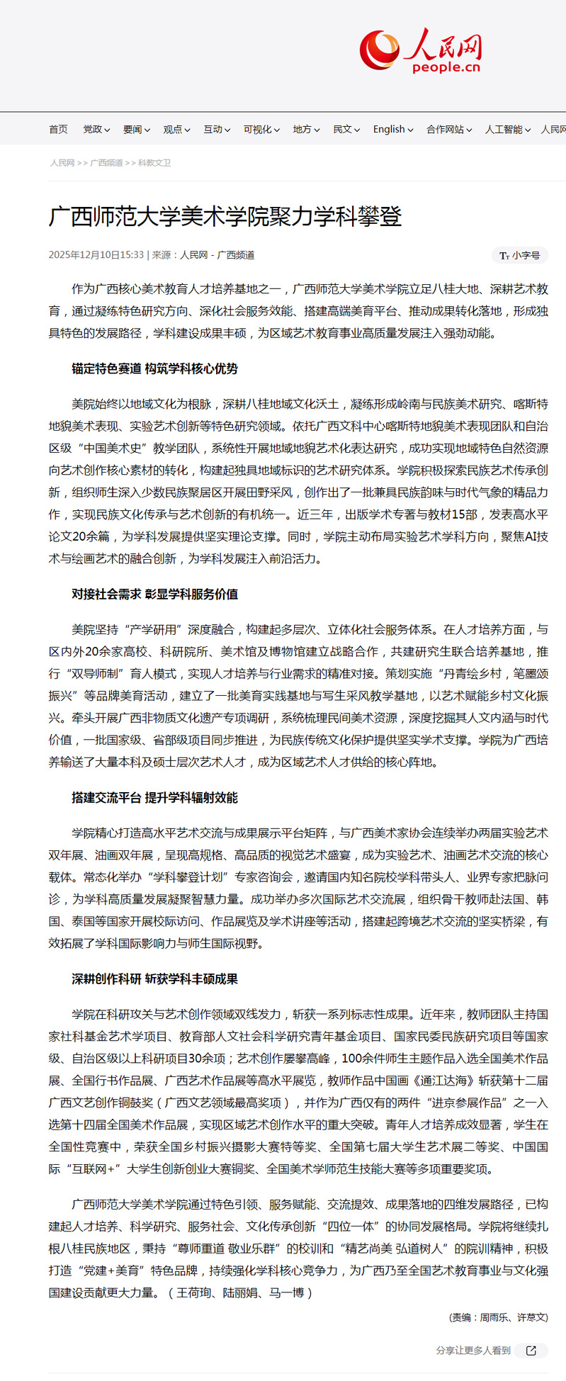 12月10日,【人民网】关注报道我校美术学院聚力学科建设,立足八桂地域文化,凝练出岭南与民族美术研究、喀斯特地貌美术表现、实验艺术创新等特色方向,构建起独具标识的研究体系。美术学院坚持“产学研用”融合,通过校地合作、建立美育实践基地、开展非遗调研等方式,精准对接社会需求,服务乡村文化振兴。美术学院积极搭建高水平交流平台,联合举办实验艺术及油画双年展,常态化开展学科咨询与国际交流,有效拓展了学科影响力。近年来,美术学院科研创作成果丰硕,承担国家级、省部级项目30余项;师生作品屡次入选全国美展等高级别展览,并荣获广西文艺最高奖“铜鼓奖”等重要奖项,实现了人才培养与艺术创作的双重突破。通过特色引领、服务赋能、交流提效、成果落地的发展路径,美术学院已构建起“四位一体”的协同发展格局,持续为区域艺术教育事业与文化强国建设贡献力量。