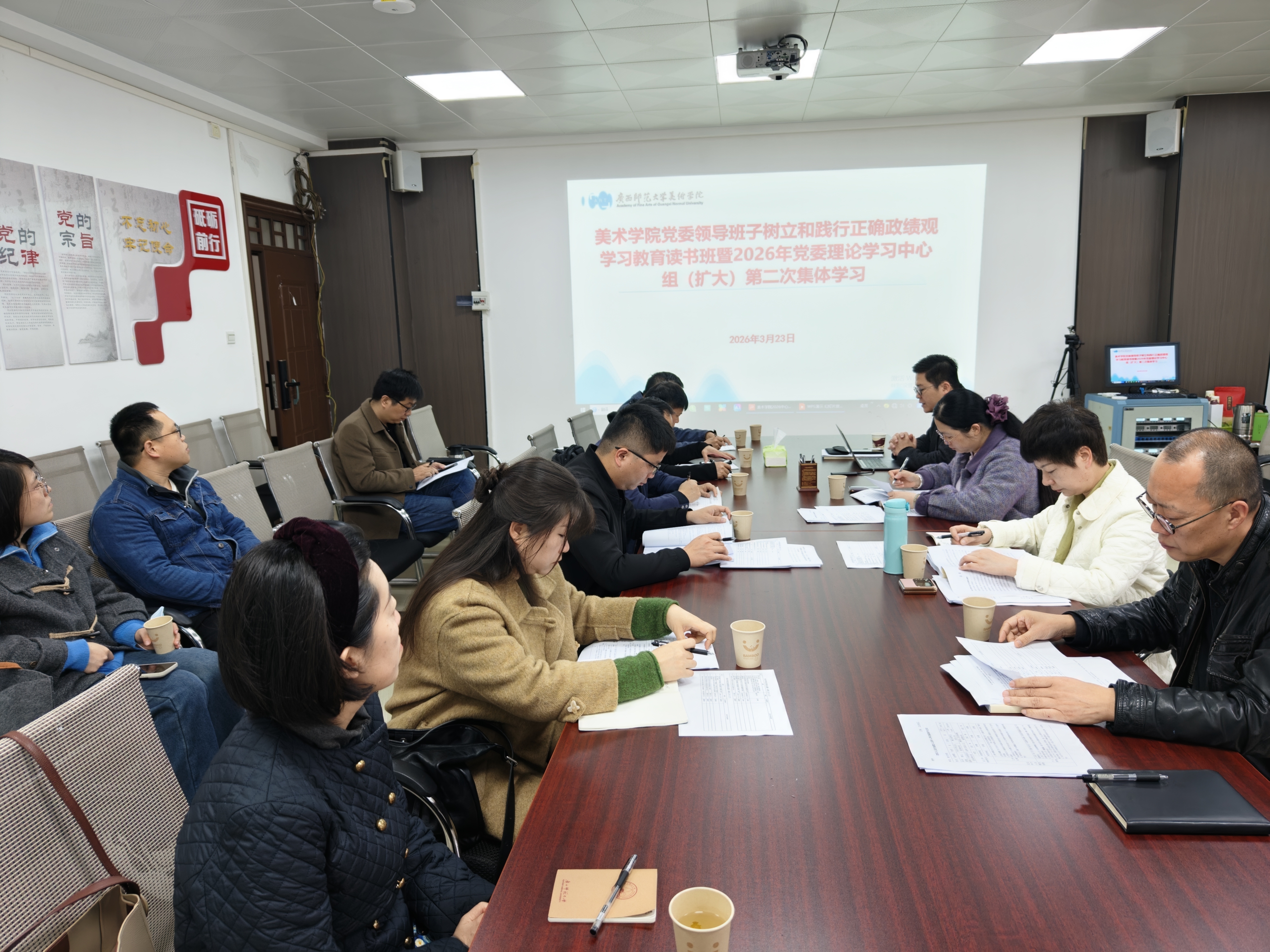3月23日上午,美术学院党委在育才校区第二文科楼北楼308会议室召开树立和践行正确政绩观学习教育读书班暨2026年党委理论学习中心组(扩大)第二次集体学习会。学院党政领导班子成员、党委委员、纪委委员、办公室主任、专职组织员、分团委书记、分工会主席、各党支部书记、全体辅导员参加学习。